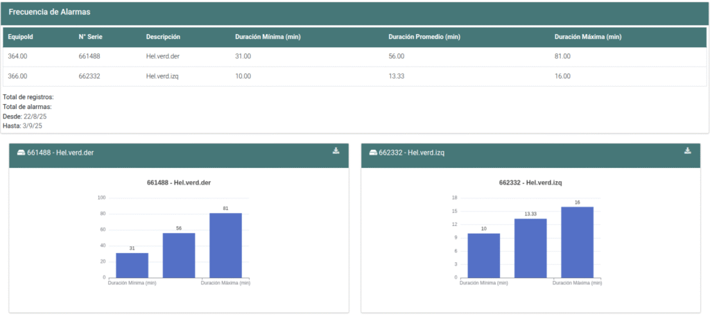 Convierte los datos en decisiones. Nuestra plataforma genera reportes inteligentes automáticos y dinámicos que muestran entre otras cosas frecuencia, porcentaje, duración de alarmas entre otras variables, así como comparativas multi-equipo y multi-sucursal. Estos informes permiten identificar patrones, anticipar problemas y optimizar recursos, a la vez que facilitan auditorías y demuestran cumplimiento normativo ante organismos de control.